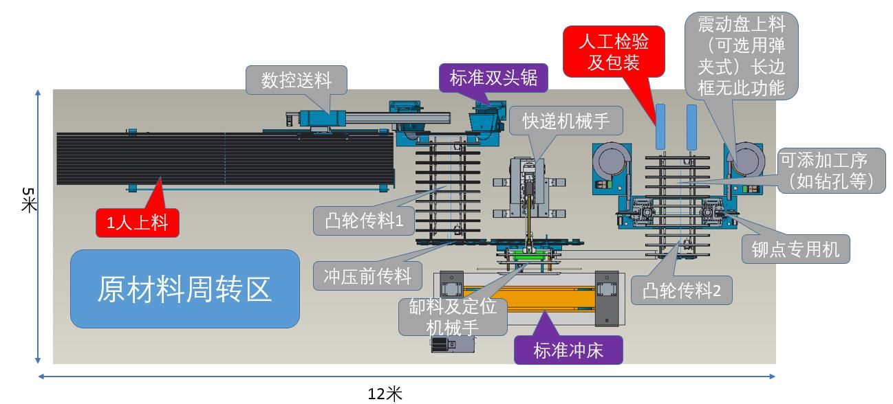 本光伏邊框生產線將機器人的智能化引入、融進該項加工工藝,為用戶生產需求量身定制。由送料傳輸、鋸切、C面沖孔、自動上角碼、內B面鉚點、長度、孔位檢測、包裝等工序組成。該光伏邊框生產線可以由傳統沖壓線及標準鋸切機及常用模具配合自動上料鋸切,下料機器人沖壓及自動上角碼,鉚點及下料等工序組成,結合了手工線的優勢,并采用機器人及智能傳料。并采用總線控制運動控制系統,滿足制造工藝的自動化控制要求,實現高效率、高精度,實現全自動化。為光伏邊框生產廠家所面臨的自動化程度低、產品質量不穩定、作業人員工作強度大等問題提供了智能自動化解決方案。